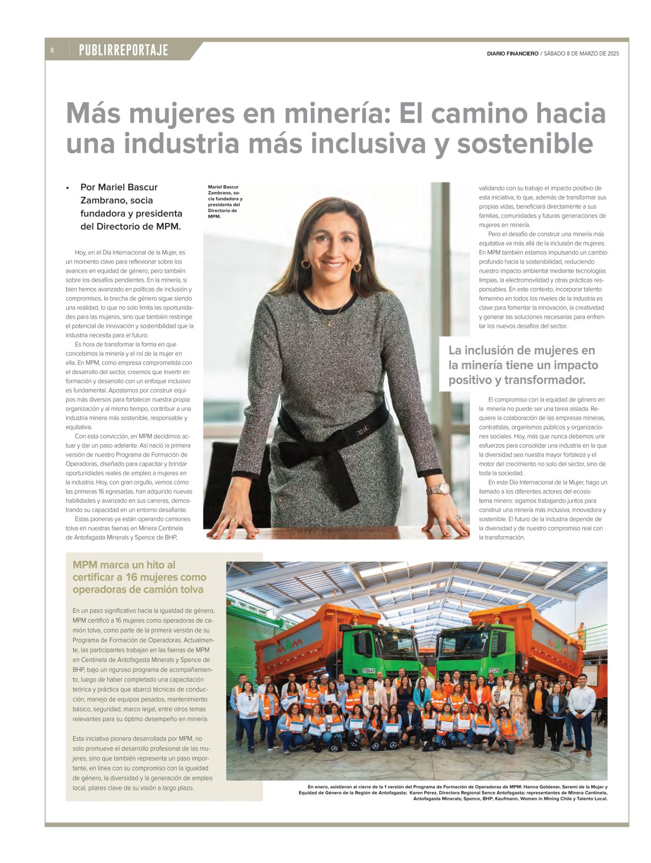 En la edición especial del Día Internacional de la Mujer de Diario Financiero, nuestra socia fundadora y presidenta del Directorio de MPM, Mariel Bascur, compartió su visión sobre la inclusión de mujeres en la industria minera, destacando que este esfuerzo debe ser conjunto entre todos los actores involucrados.